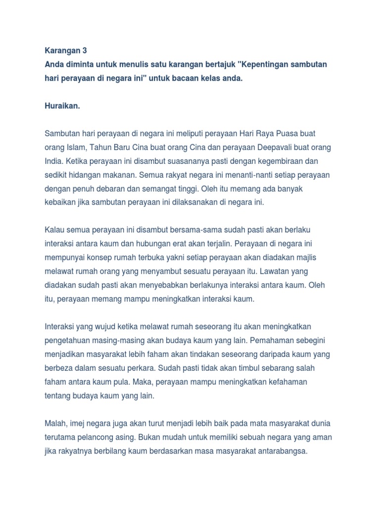 Contohnya ialah Hari Raya Aidilfitri Tahun Baru Cina Deepavali Krismas Hari Gawai dan Pesta Kaamatan. Contoh karangan bahasa melayu pt3. Pada setiap tahun banyak perayaan yang disambut di malaysia.